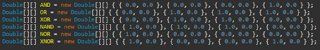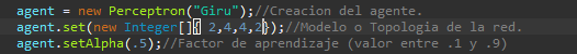 La clase Demo implementa un agente que aprende las 6 tablas elementales (AND, OR, XOR, NAND, NOR, XNOR), utiliza el siguiente algoritmo de entrenamiento.